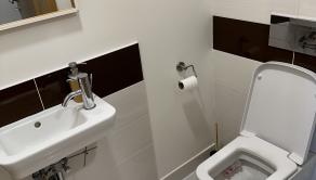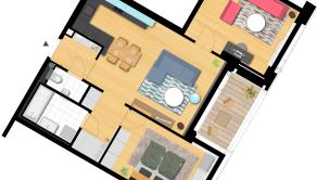 Dispozične je veľmi dobre riešený, pri vstupe je samostatná toaleta s umývadlom, obývacia izba prepojená kuchyňou s jedálenskou časťou s východom na terasu.